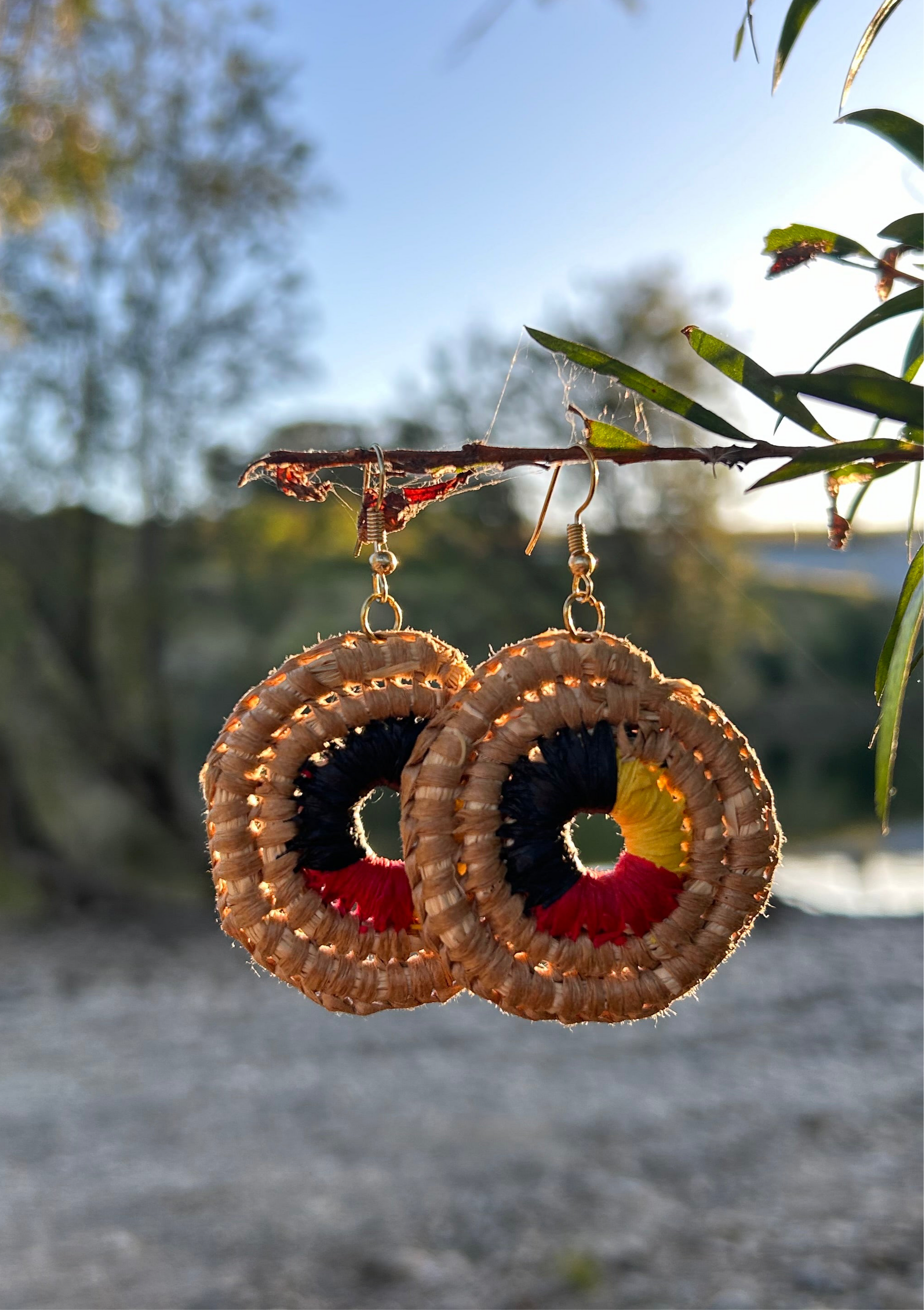 These statement earrings feature a representation of the Aboriginal flag in a coil design surrounded by the natural raffia colour